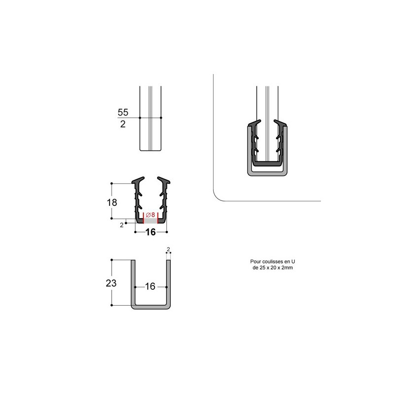 Profilé pour coulisse en U standard de 25 x 20 mm et d'épaisseur 2 mm, destiné à la mise en place de panneaux divers ou de vitrages sur profilés métalliques à gorge.