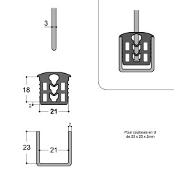 Profilé pour coulisse en U standard de 25 x 25 mm et d'épaisseur 2 mm, destiné à la mise en place de panneaux divers ou de vitrages sur profilés métalliques à gorge.